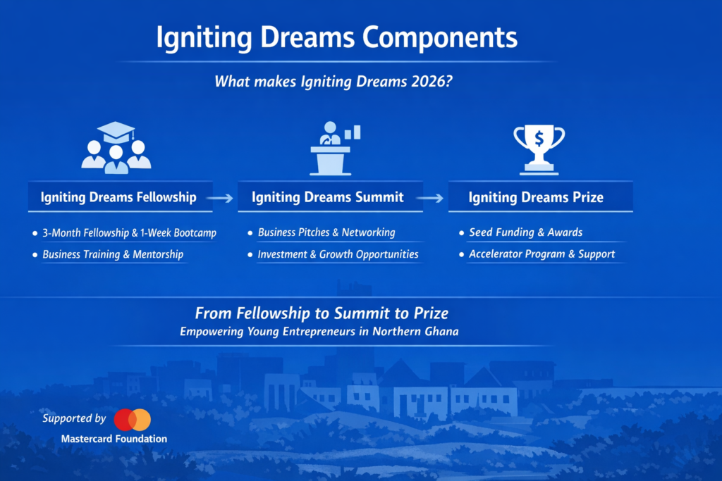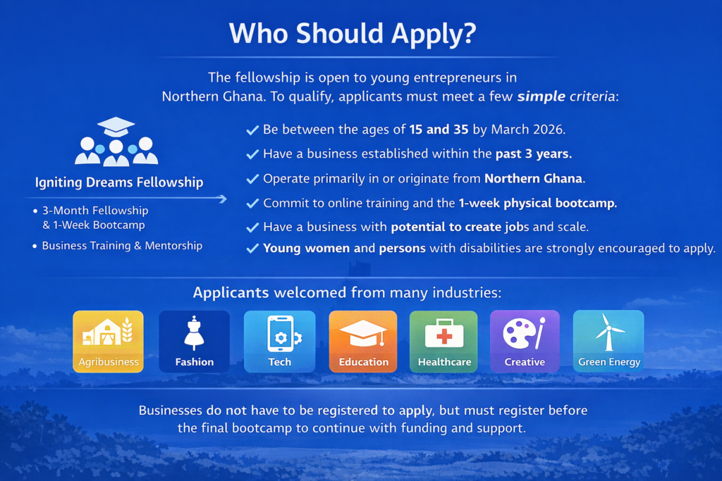 The Igniting Dreams Fellowship is a structured, three-month programme that combines online training with practical learning. Selected entrepreneurs between 15 and 35 years old will take part in hybrid sessions that sharpen their business skills. The programme ends with a one-week in-person boot camp in Wa, Ghana.